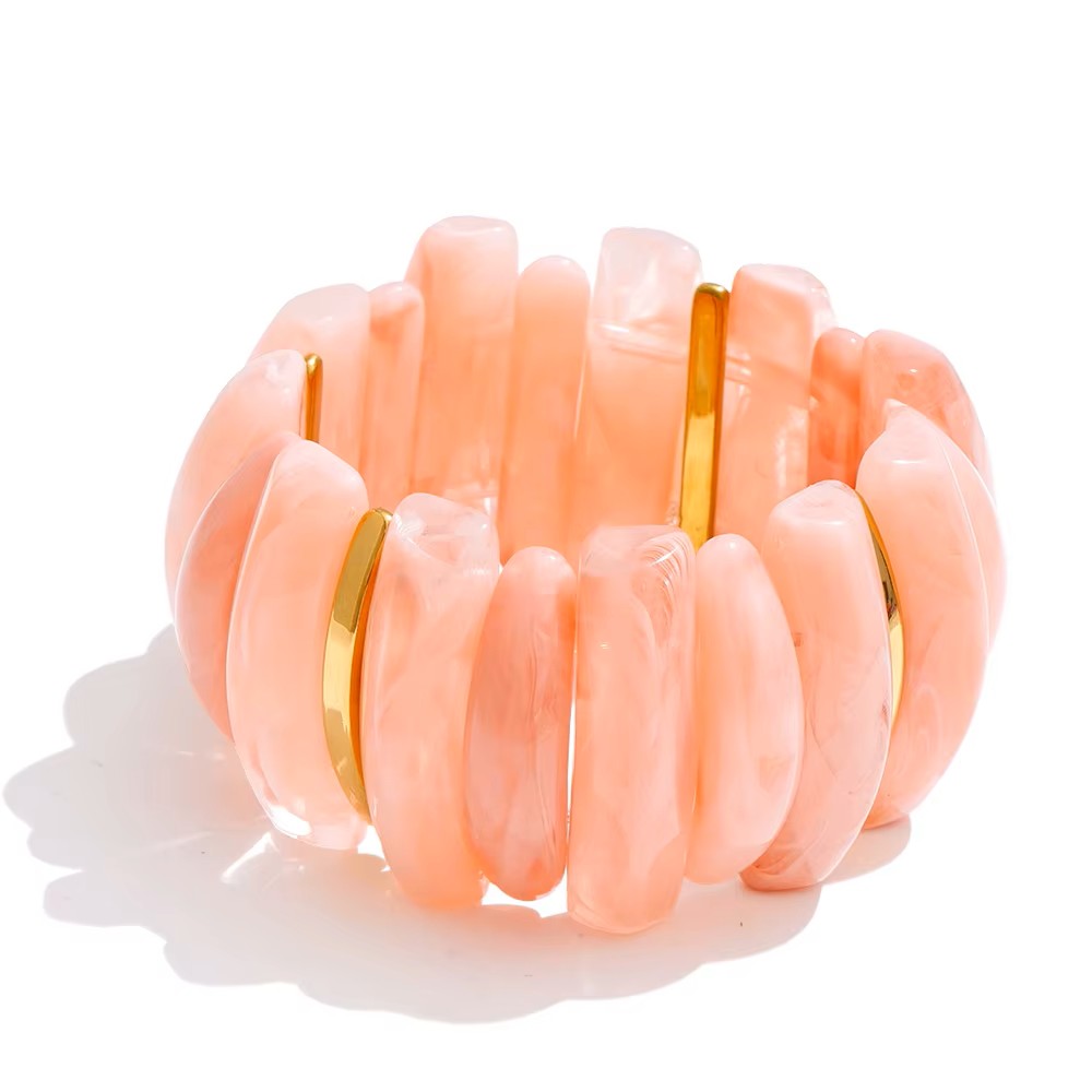 Ett statementarmband i resin som kombinerar kraftfull design med en mjuk, feminin färgpalett. Med sin generösa höjd på 4 cm och sina organiskt formade länkar skapar det en tydlig silhuett som drar blickarna till sig.