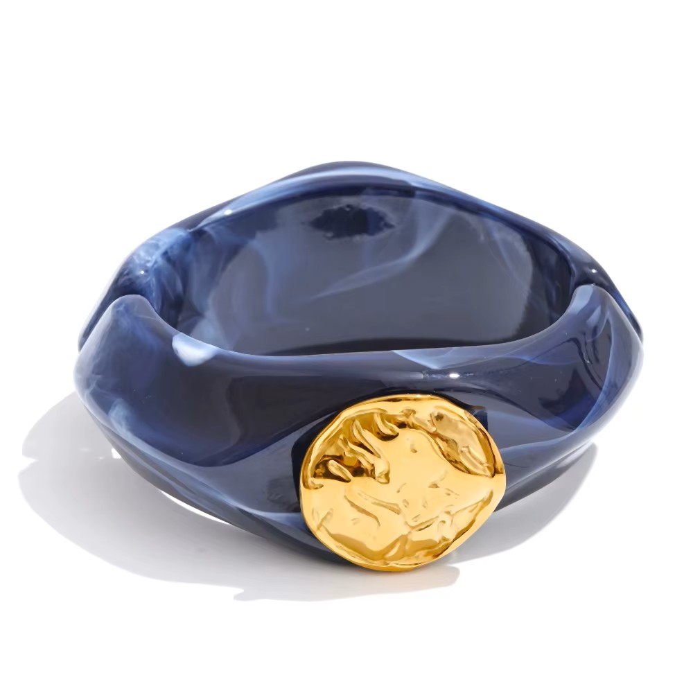 En öppningsbar armring i resin med mjukt oregelbundna former och en djup blå ton med marmorerade skiftningar. Färgen drar mot midnattsblå och ger ett lugnt uttryck som samtidigt känns modernt och trendigt.