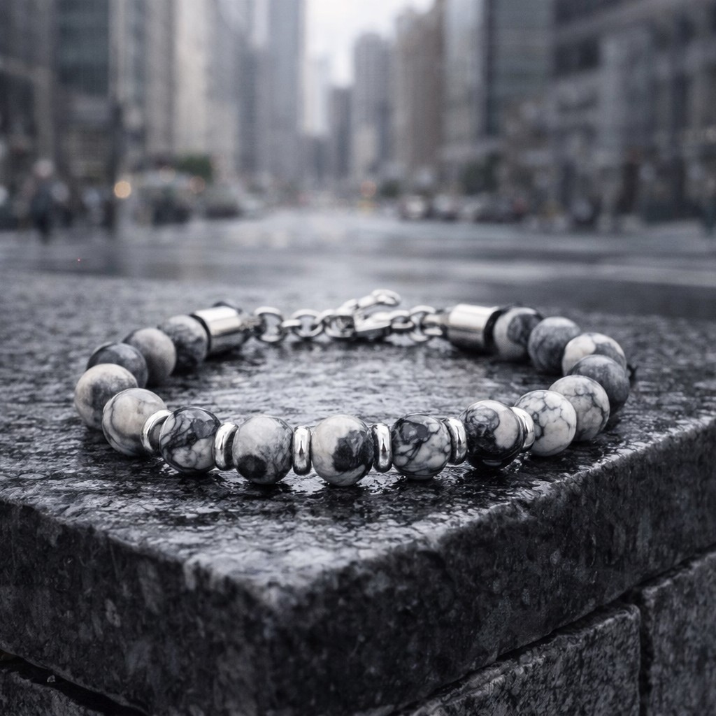 Detta eleganta armband är dekorerat med 0,8 cm stora runda pärlor av stenen Network, vars unika mönster påminner om naturens egna konstverk. Stenen sägs främja balans och lugn, samt hjälpa bäraren att hitta klarhet i sina tankar.