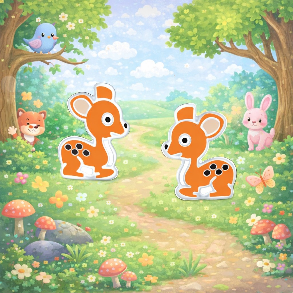 Små barnörhängen i äkta silver med färgad emalj, här i formen av en rådjur.