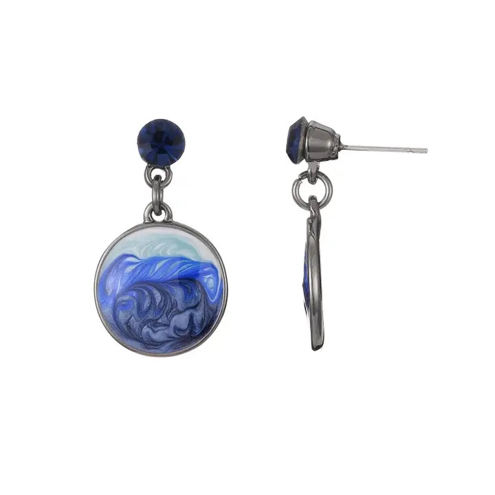 Härliga örhängen med en blå kristall i toppen och en emaljerad blå våg hängandes under kristallen, modellen heter Xalvadora och kommer från varumärket Belle Miss Paris.