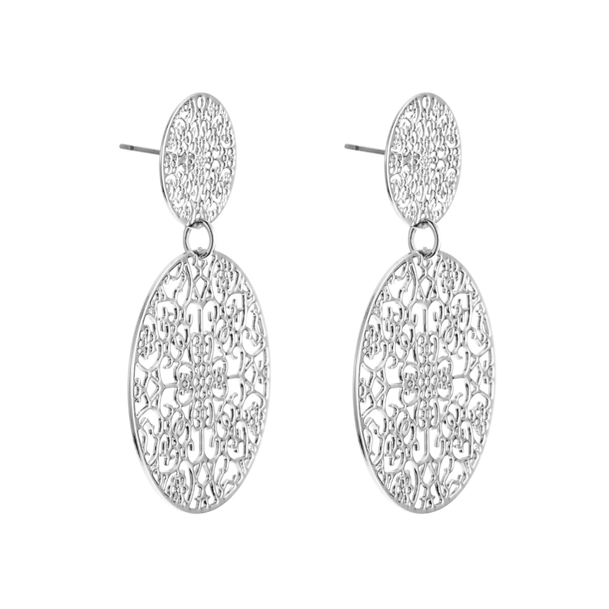 By Jolimas klassiska ultratunna och superlätta örhängen i silverfärg. De är perfekta när du vill bära något som märks – men knappt känns. Två eleganta ringar med utsnidat mönster skapar en luftig och detaljerad design med en känsla av marockansk inspiration.