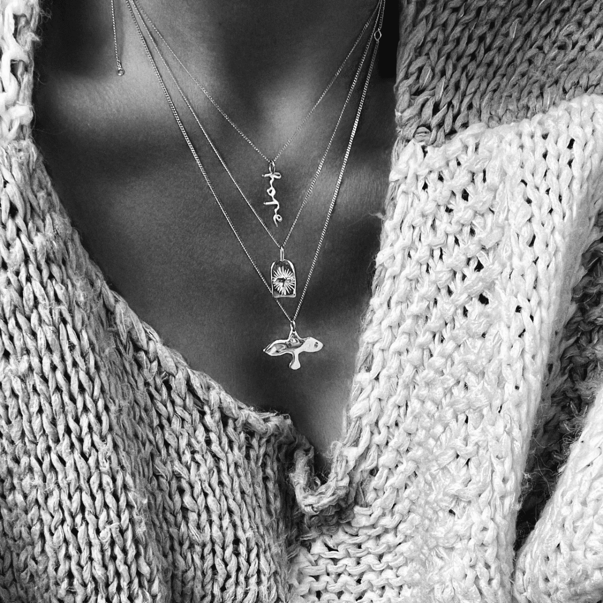 Window Dove Necklace är ett unikt halsband där en elegant berlock formar ett litet fönster. I mitten, omgiven av mjukt strålande ljus, svävar den fina duvan som är en symbol för fred, hopp och inre styrka. Ett smycke som fångar känslan av att släppa taget och våga flyga.