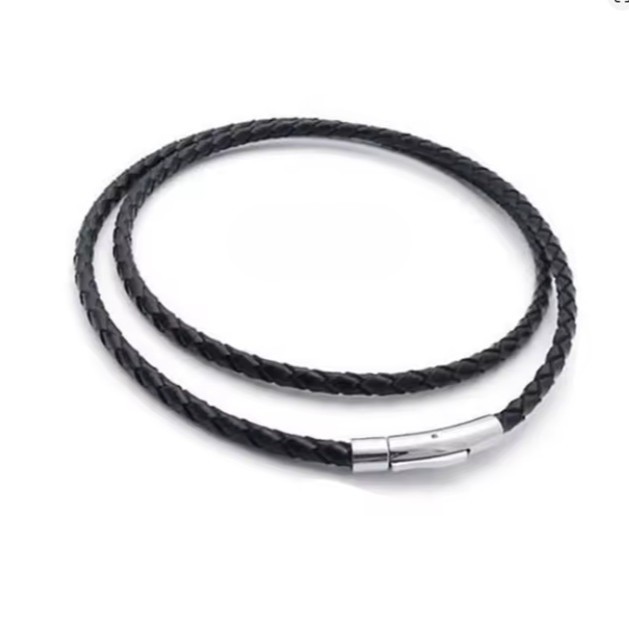 Flätat läderhalsband i svart med "klicklås" i stål. Elegant, tidlöst och mångsidigt halsband som passar både tjejer och killar.