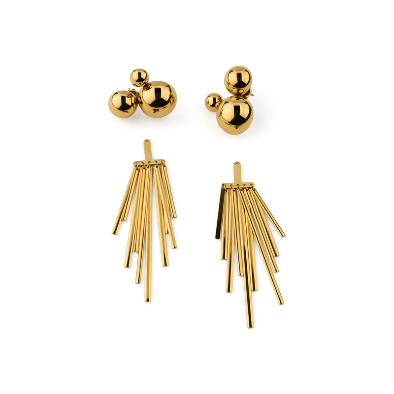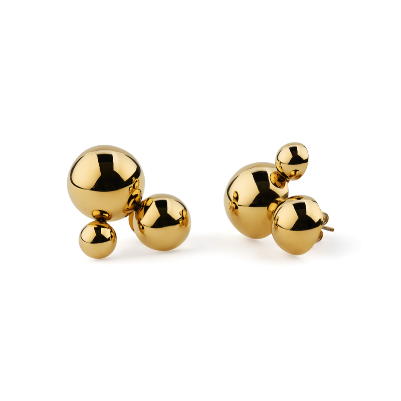 Grandiosa örhängen iguldpläterat stål med ett kluster av halvkulor och ett avtagbart skimrande hänge. Bär från dag till natt, variera med att bära dem med eller utan hänget. Designad för den som älskar att uttrycka sig genom sina accessoarer.
