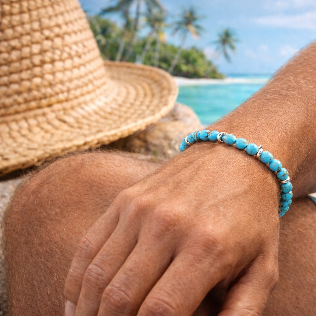 Turkos är relativt mjukt och poröst jämfört med andra ädelstenar, så undvik att utsätta ditt armband för starka kemikalier, extrema temperaturer och långvarigt solljus. Rengör den med en mjuk trasa och milt tvålvatten.