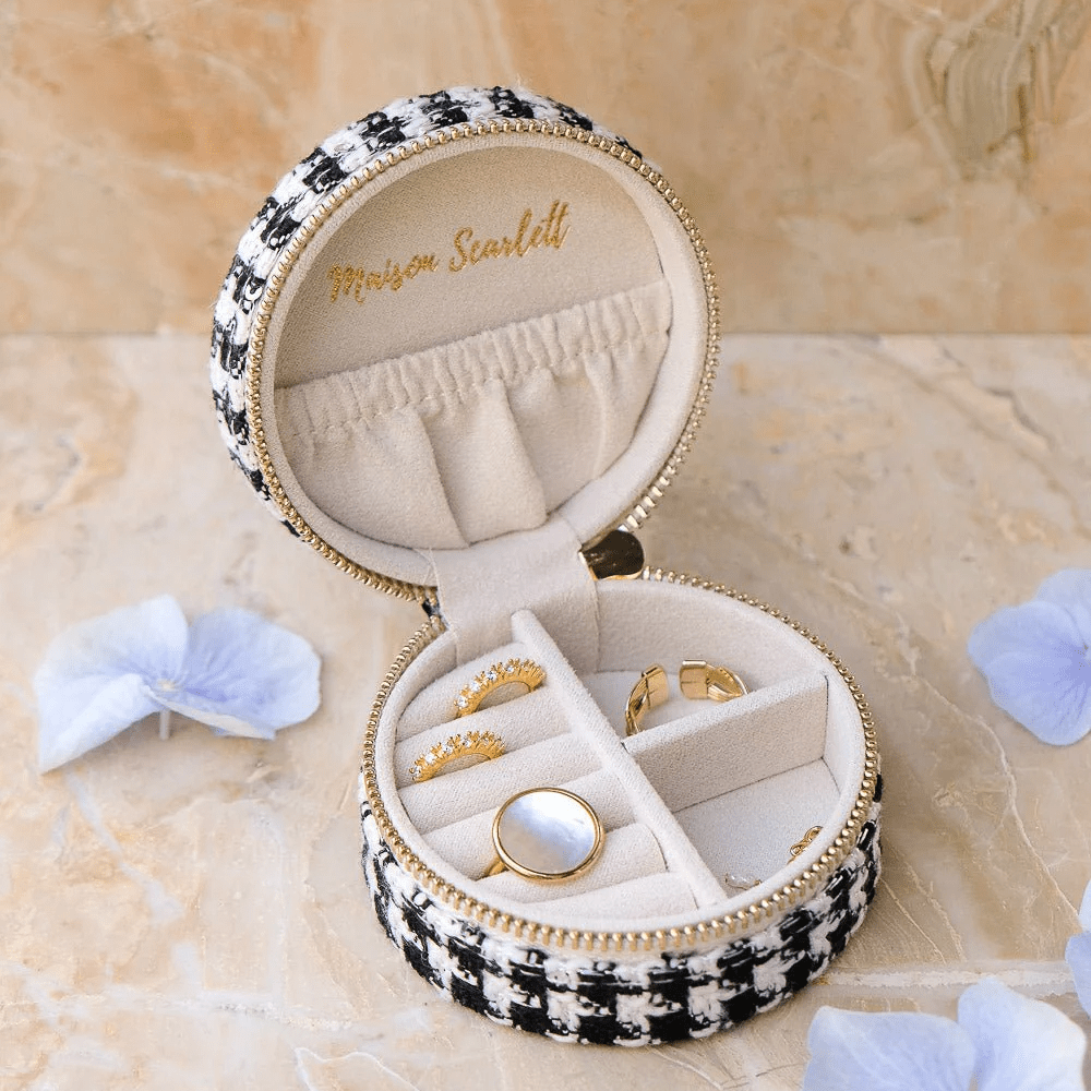 Insidan i mjuk sammet omfamnar dina smycken med omsorg, medan de guldfärgade detaljerna adderar en varm kontrast till det grafiska temat. En chic kompanjon som känns lika självklar på nattduksbordet som i weekendväskan.