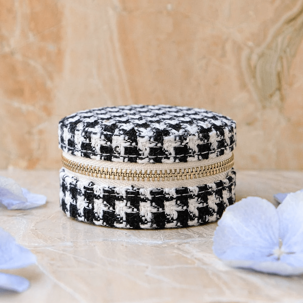 Yvonne i klassiskt houndstooth-mönster är definitionen av fransk modernitet möter brittisk arv. Textilen ger en grafisk skärpa som känns både intellektuell och elegant – tänk ikonisk tweed med en samtida twist. Det här är boxen för dig som uppskattar struktur, stil och lyx.