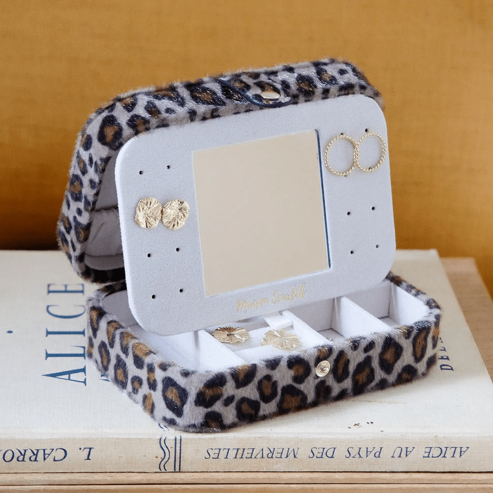 Brigitte i beige sammet är en liten box med stor personlighet. Det sammetslena tyget är tidlöst, en perfekt accessoar för den som reser med attityd och alltid vill ha allt i perfekt ordning.