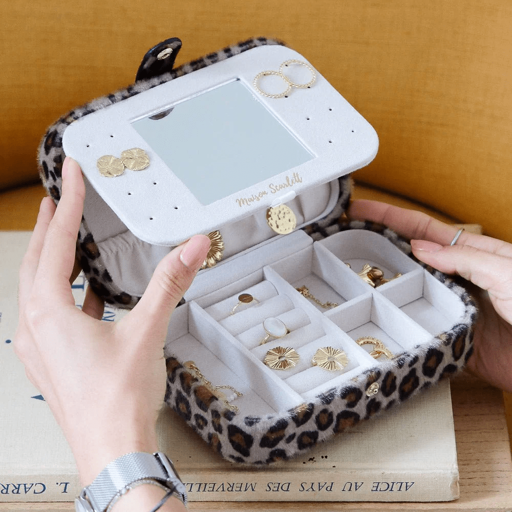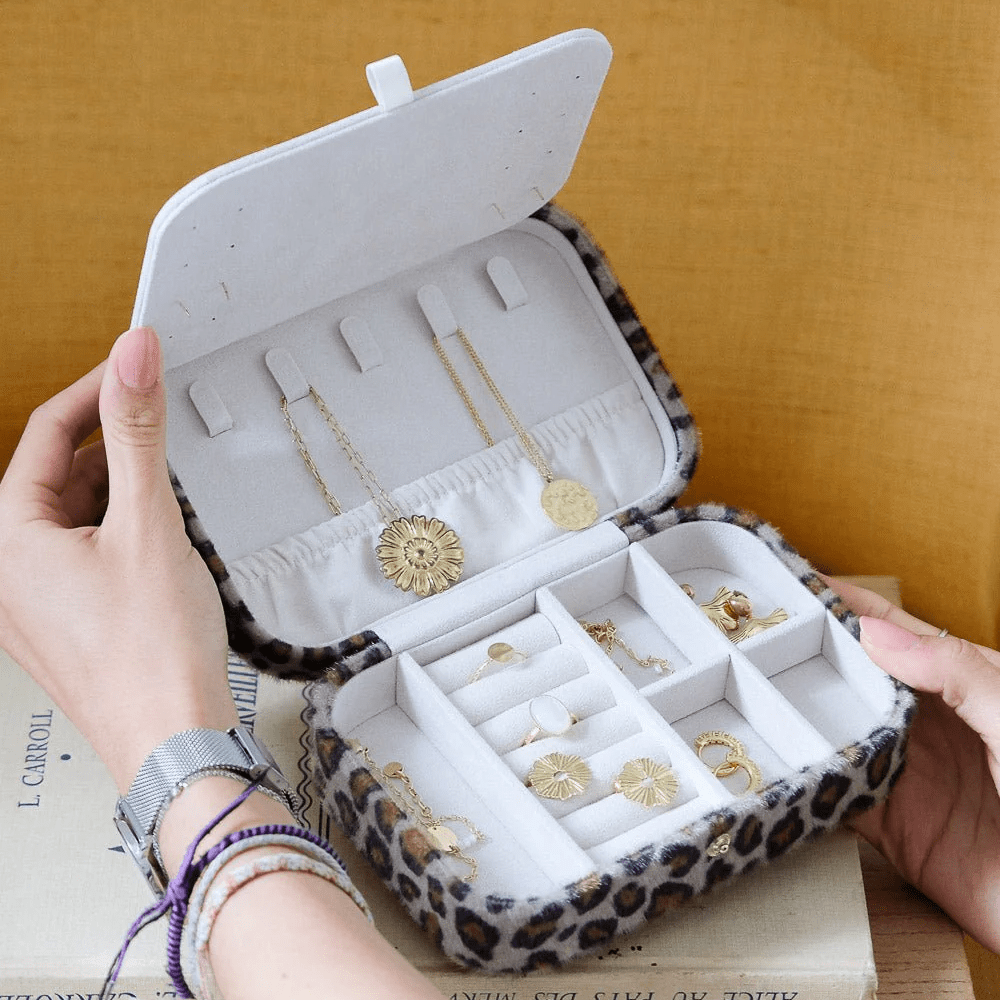 Rymmer upp till 12 ringar, 8 par örhängen, 5 halsband och 4 mjuka armband.