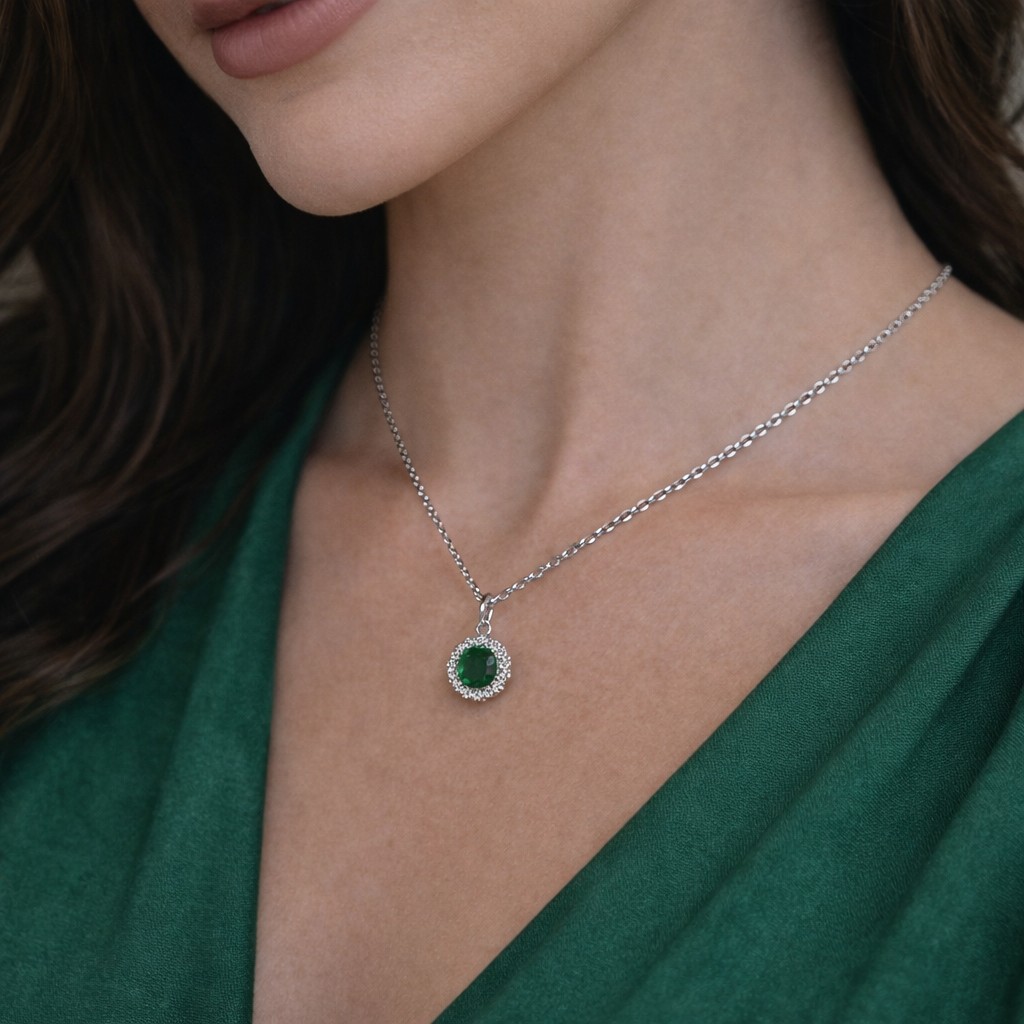 I centrum av halsbandet finner du ett kristallklätt runt hänge som stoltserar med en centrerad grön kristall av färgen Emerald – Maj månadssten. Denna smaragdgröna kristall är inte bara en symbol för renhet och föryngring, utan också en förtrollande accessoar för varje tillfälle. Den grön kristallen omgärdas av 24 små, klara och gnistrande kristaller som fångar ljuset från alla vinklar, vilket ger hänget en strålande och oemotståndlig glans. Kombinationen av den djupt gröna smaragden och de klara kristallerna skapar en magisk kontrast som drar blickarna till sig och framhäver din personliga stil.