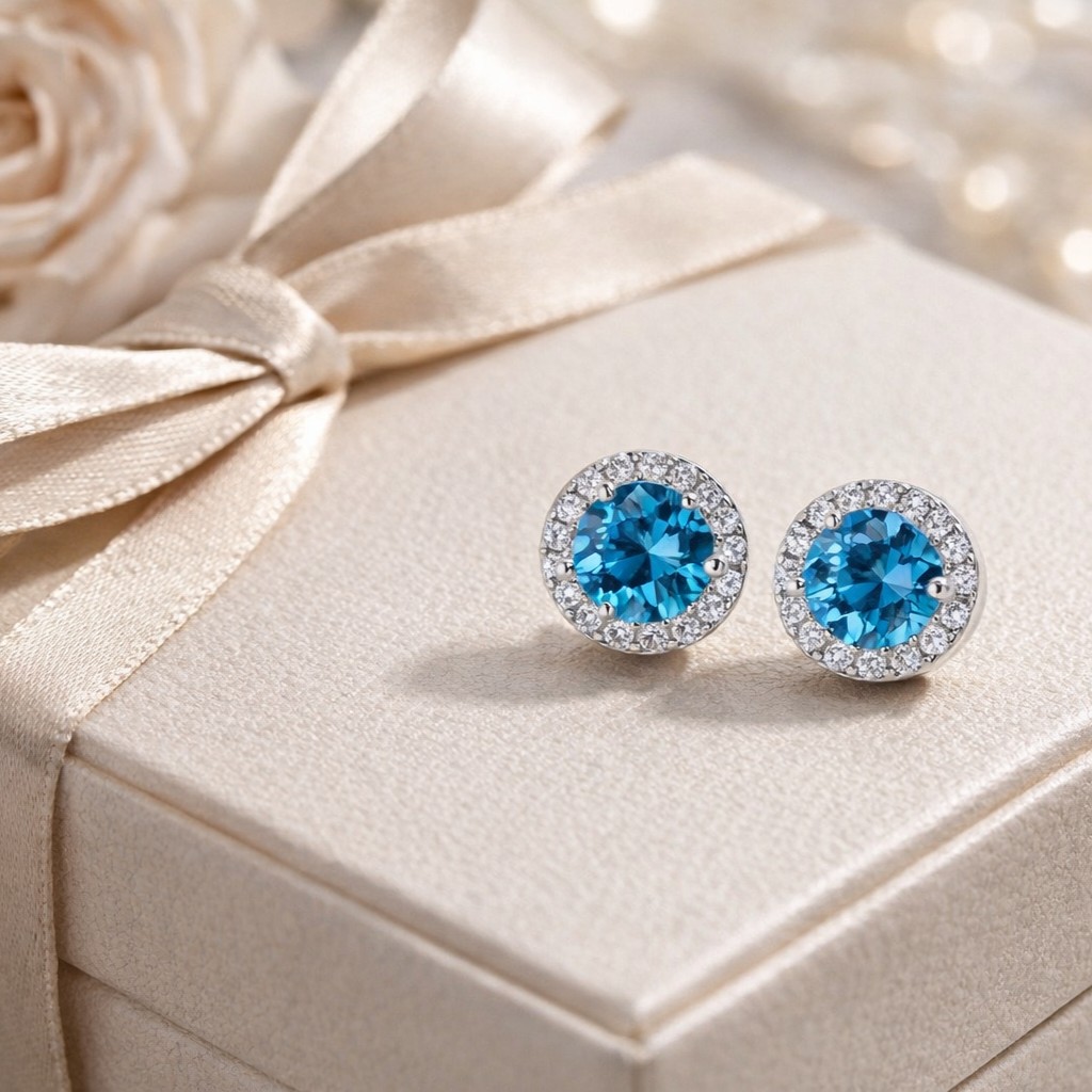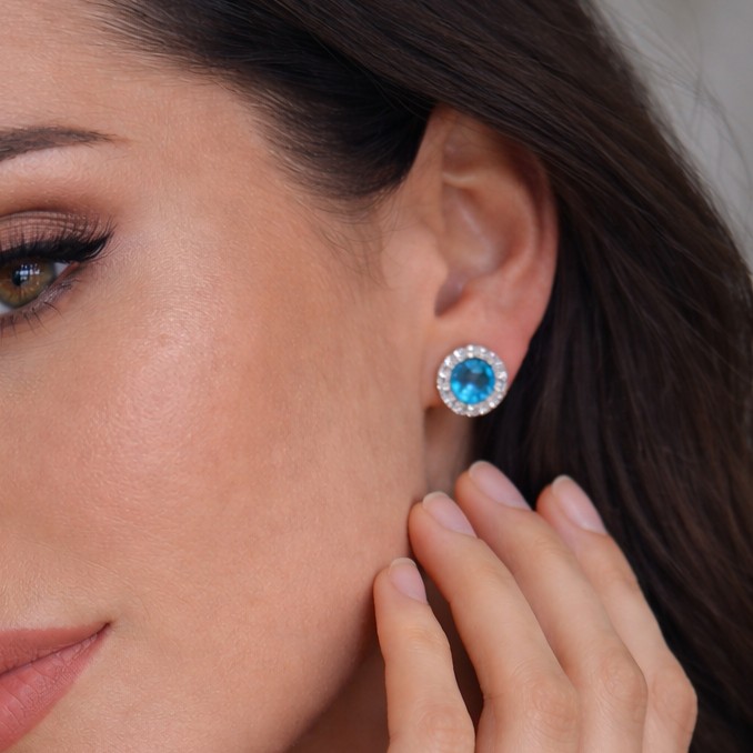 Kolla in The Botildas eleganta örhängen tillverkade i äkta silver, en favorit bland våra kunder och en tidlös klassiker. Varje örhänge är prytt med totalt 25 kristaller, vilket skapar en strålande och förtrollande effekt. Designen centreras kring en stor, vacker blå kristall i färgen Aquamarine. Den djupt blå Aquamarine-kristallen är omgärdad av 24 små, klara kristaller som förstärker dess glans och ger örhängena en oemotståndlig lyster.