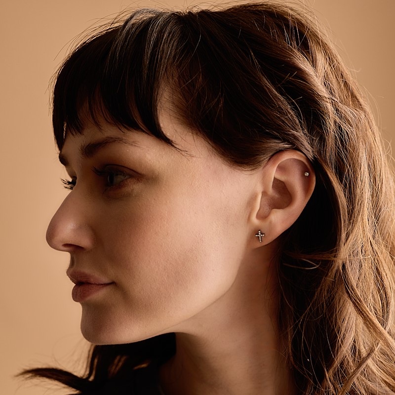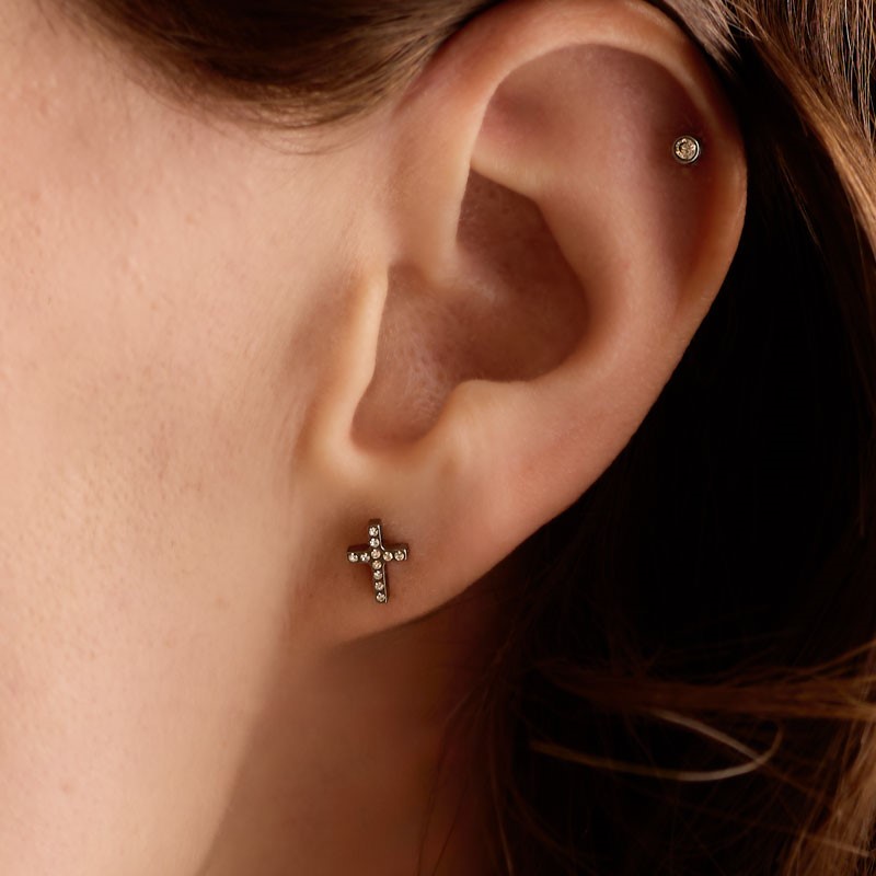 Eleganta studsörhängen i hudvänligt titan. De 0,8 cm stora korsen är klädda med gnistrande klara kristaller som fångar ljuset och ger en extra touch av glamour.