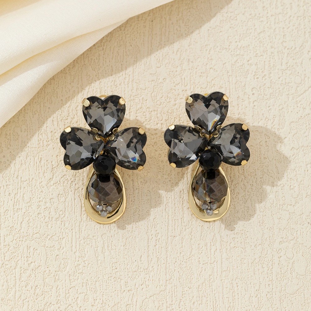 Eleganta clipsörhängen i guldfärgad metall med hjärtformade, facetterade stenar i djup svart ton. Designen kombinerar flera kristaller i harmoniska former som tillsammans skapar ett stilrent men uttrycksfullt smycke.