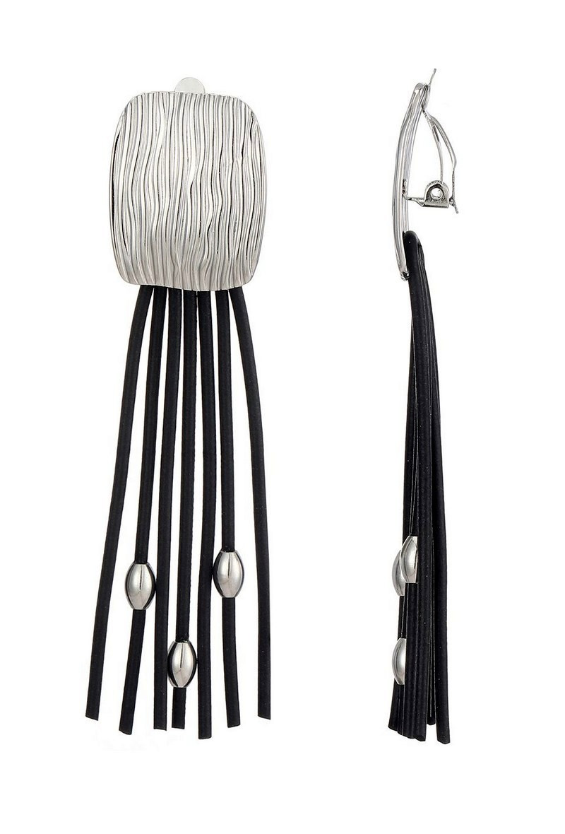 För dig som gillar rena linjer och ett mer uttrycksfullt formspråk. Dessa clipsörhängen kombinerar en strukturerad silverplatta med långa, svarta remmar som rör sig mjukt och skapar en levande silhuett.