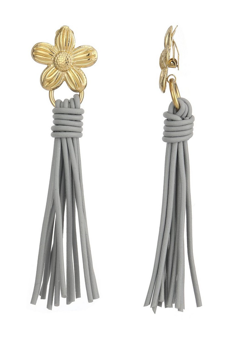 Låt din sommarstil blomma med dessa eleganta clipsörhängen i fransk design. Den gyllene blomman möter en mjukt fallande tofs i dämpad grå nyans en perfekt kombination av lekfullhet och enkelhet.