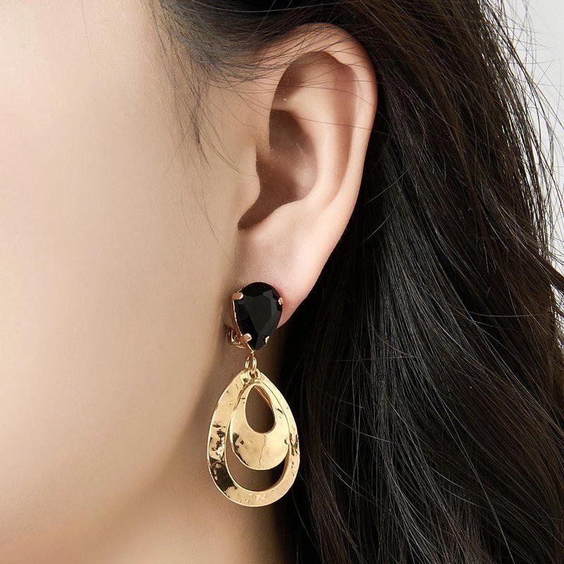 Clipsörhängen med en facetterad svart sten och två sammanlänkade, hamrade ringar i guldfärg. Den råa ytan möter den eleganta stenen i en balanserad design som ger både karaktär och rörelse. Ett statementörhänge som lyfter även den enklaste outfit.
