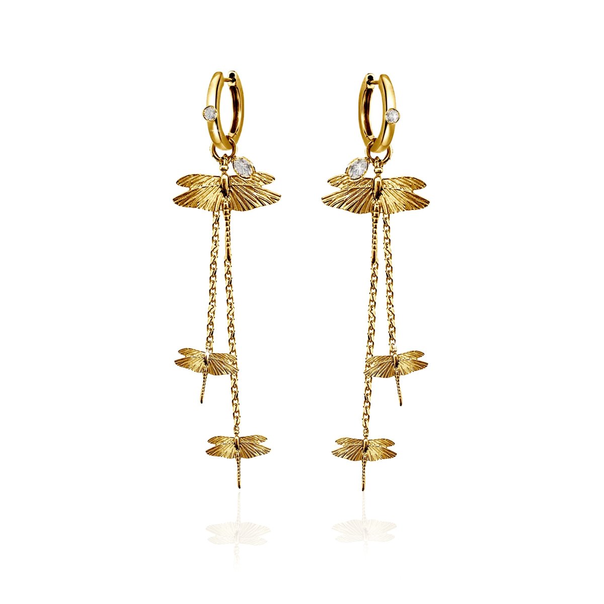 Dragonfly Hoops i guldfärg är ett riktigt statement smycke. De tre hängande trollsländorna skapar ett vackert, levande fall och ger en exklusiv känsla av rörelse och elegans. Den gyllene ytan tillsammans med de klara kristallerna ger smycket en varm och lyxig glans. Ett perfekt val för dig som vill kombinera unik design med feminin styrka.