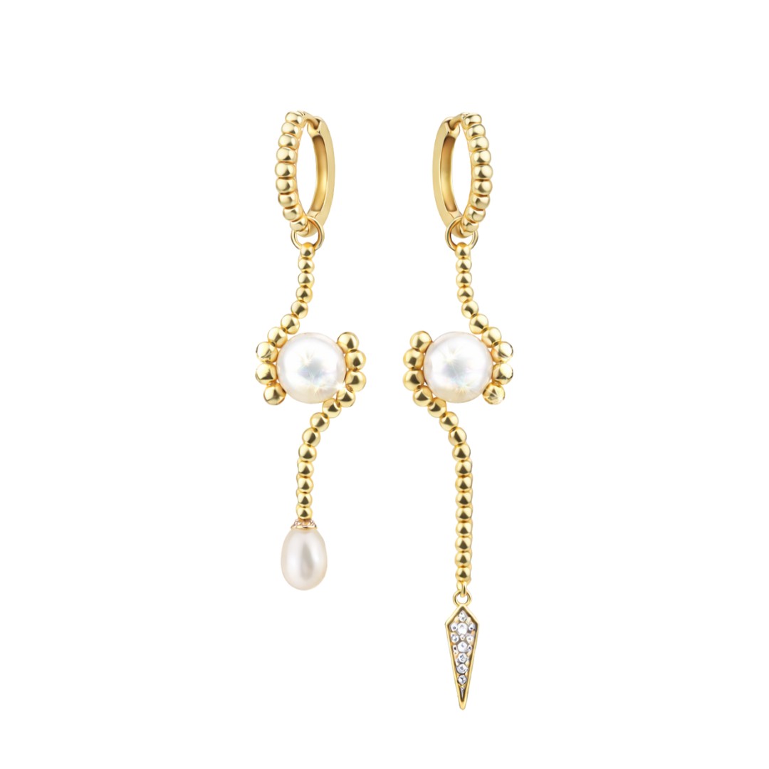 Dessa örhängen från Ioaku är designade i asymmetrisk stil med olika längd, vilket ger en modern och självsäker look. Skulpturala gulddetaljer möter mjuka pärlor i en lekfull kontrast som fångar blicken utan att bli för mycket. Perfekta när du vill sticka ut utan att försöka.