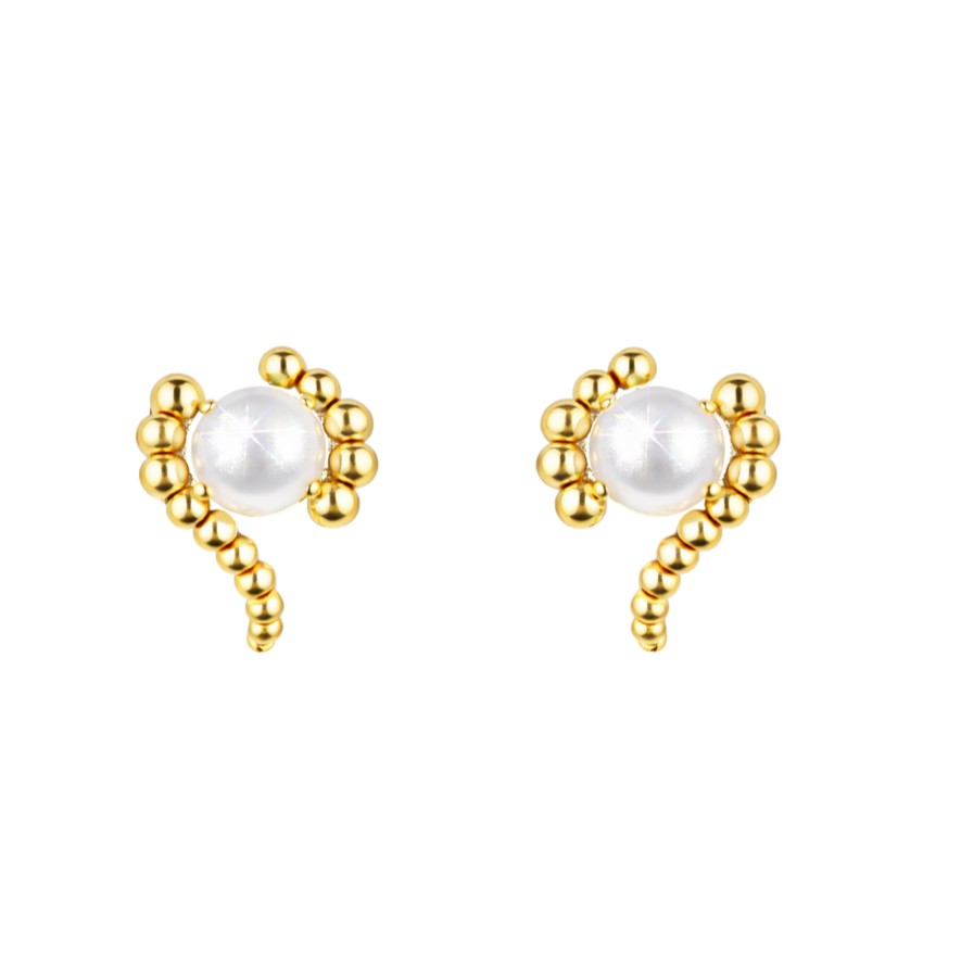 De här studs-örhängena leker med kontraster, en rund lugn pärla omfamnad av organiska gulddetaljer som nästan känns handformade. Resultatet är en look som är clean men ändå statement. Perfekta när du vill addera något unikt utan att anstränga dig.