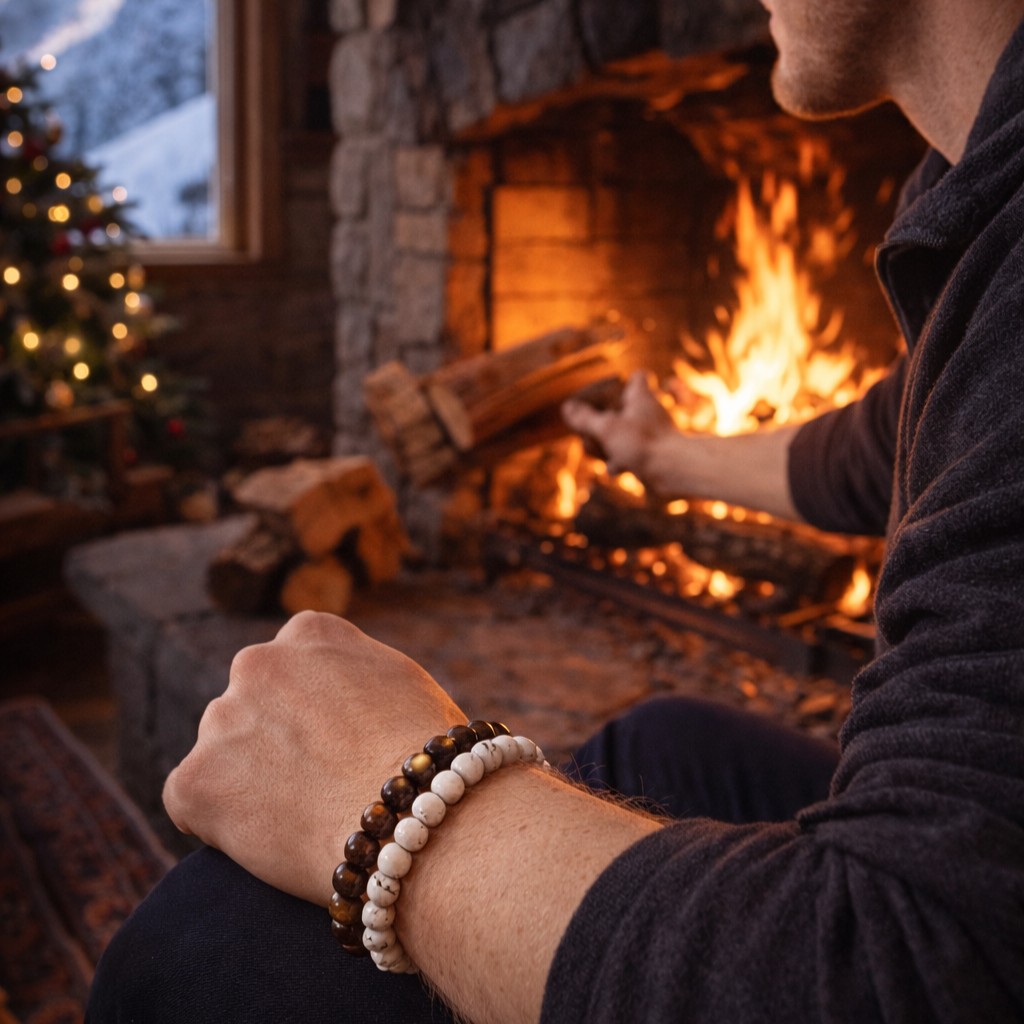 Två elastiska armband med naturliga stenar på, här med brun tigeröga på det ena armbandet och vit howlite på det andra armbandet.